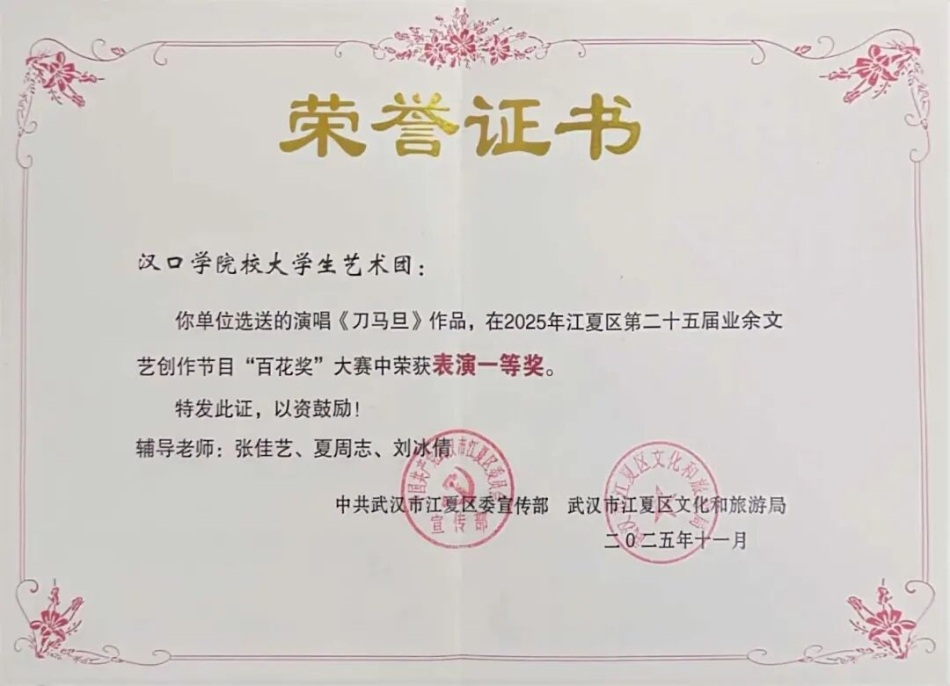 近日,江夏区第二十五届业余文艺创作节目“百花奖”大赛圆满落幕,williamhill威廉希尔官网校大学生艺术团选送作品《刀马旦》从众多参赛节目中脱颖而出,荣获一等奖。